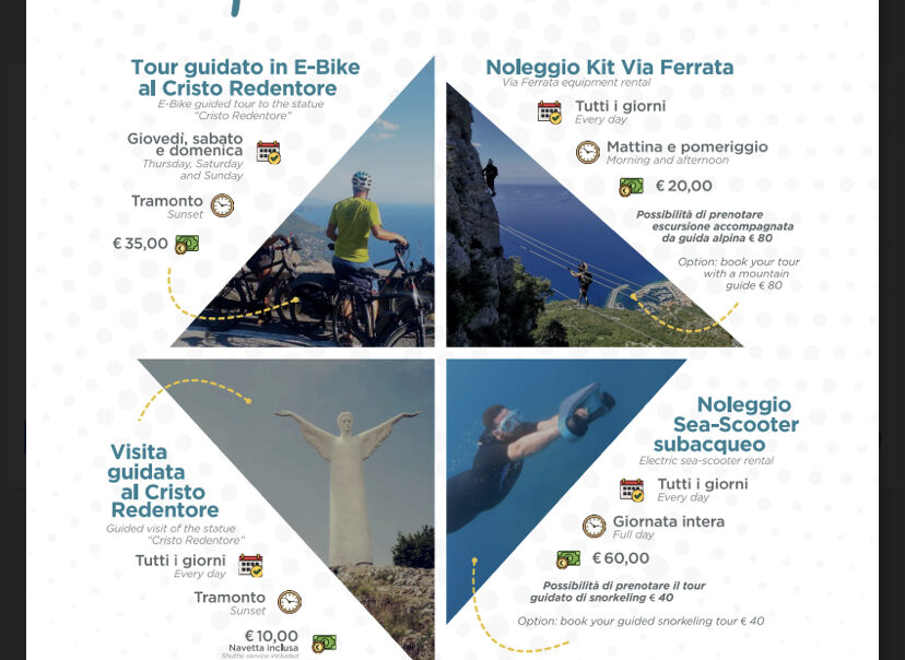 Tour guidato in E-Bike verso il Cristo di Maratea Dal centro storico di Maratea percorreremo, con una bicicletta a pedalata assistita, la strada panoramica per raggiungere e visitare la maestosa Statua del Cristo Redentore, accompagnati da una guida cicloturistica. Vivi […]